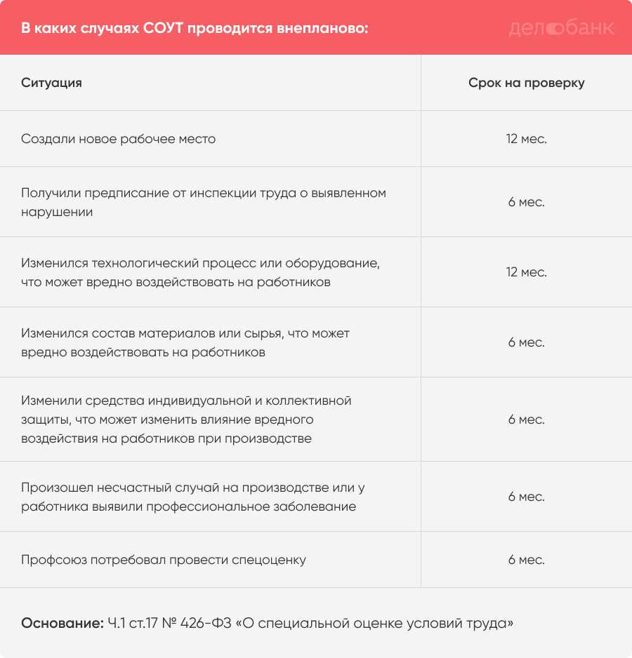 Срок действия СОУТ — 1 раз в 5 лет. Можно проводить чаще, но, если пропустить этот срок, возможно наступление административной ответственности, о которой мы написали выше. Но не всегда спецоценку проводят по плану. Иногда возникают обстоятельства, при которых СОУТ должна быть проведена во внеочередном порядке.