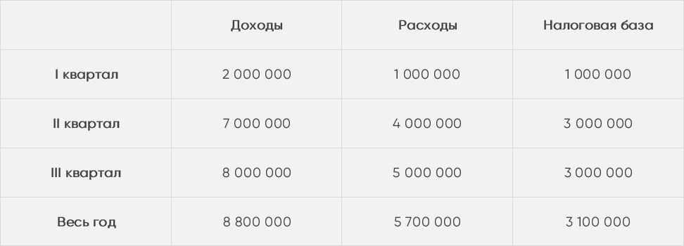 В декларации нужно заполнять доходы и расходы поквартально, причём нарастающим итогом. Чтобы разобраться, рассмотрим простой пример.