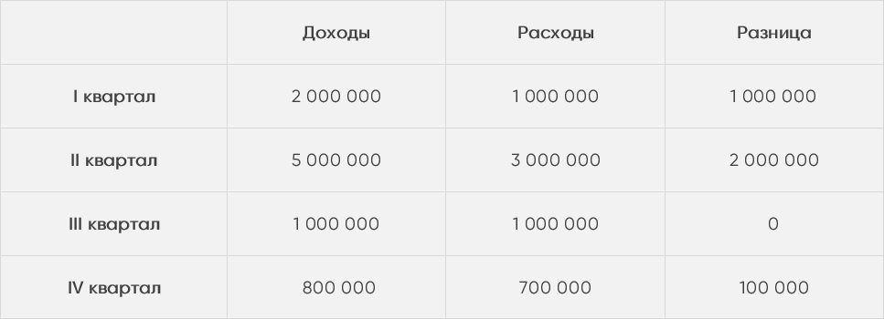 Чтобы посчитать показатели нарастающим итогом за квартал, нужно сложить прошлый и текущий кварталы. Например, в I квартале доход 2 млн рублей, а во втором — уже 7 млн рублей. Получается, что доходы и расходы Илона нарастающим итогом будут выглядеть так.