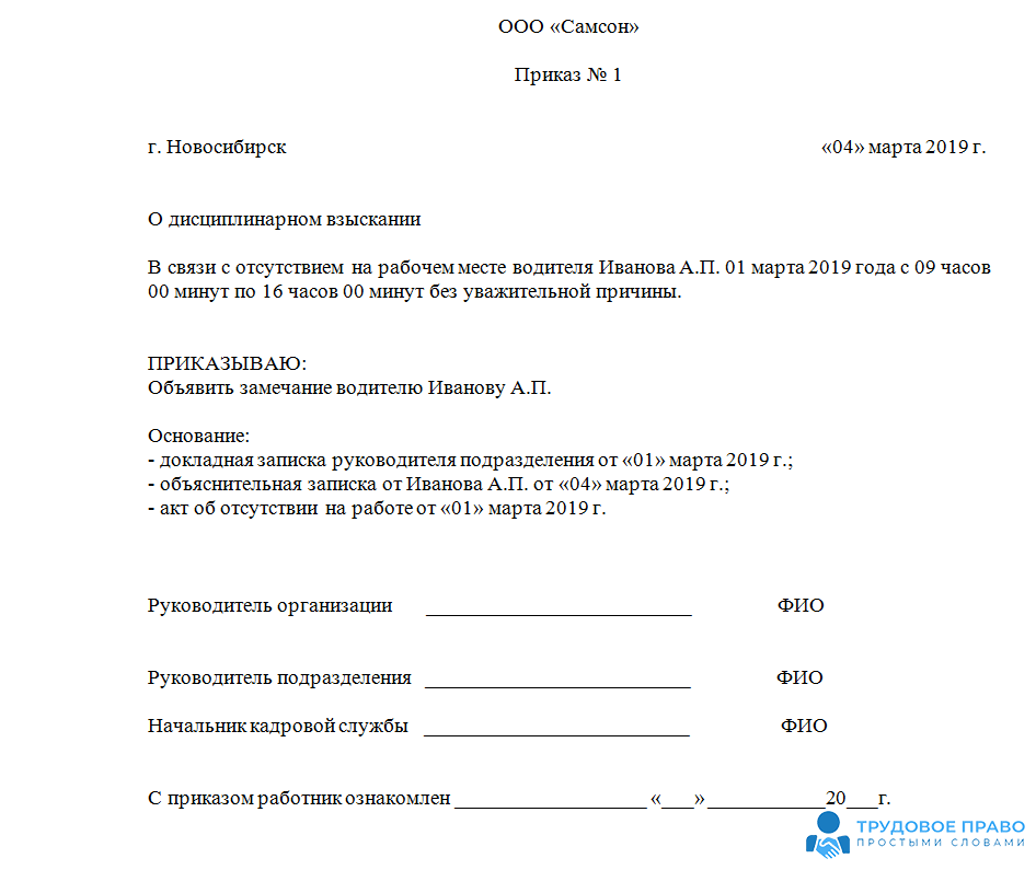 С их помощью работодатель сможет подтвердить, что лицо действительно не присутствовало на рабочем месте. На таком основании издаётся . Действующими нормами не предусмотрено единой формы для такого документа, поэтому наниматель составляет его на своё усмотрение. Сам приказ состоит из нескольких частей: