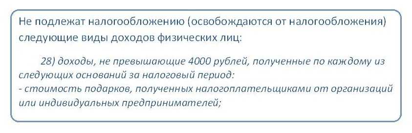 Однако в соответствии с п. 28 ст. 217 НК РФ стоимость подарков, не превышающая за налоговый период 4000 руб., освобождается от налогообложения НДФЛ.