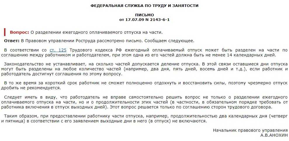 Зачастую предприятию невыгодно отсутствие сотрудника период, обозначенный законом — 28 дней. Сами служащие тоже предпочитают делить отдых, используя его частично на протяжении года, однако без доброй воли обеих сторон дробление отпуска недопустимо,то есть наниматель не вправе вынуждать сотрудника без его одобрения разбивать отдых, поскольку это нарушает положения законодательства (Письмо Роструда № 2143-6-1 от 17 июля 2009 года).