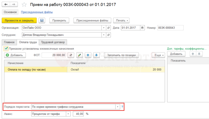 Так как для сотрудника Дятлова В.Г. порядок пересчета отличается от способа, заданного в целом для информационной базы, то при регистрации приема на работу этого сотрудника на вкладке Оплата труда в реквизите Порядок пересчета выбирается значение — По норме времени графика сотрудника: