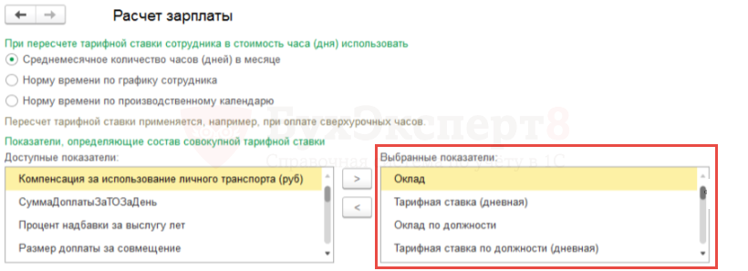 Как будет определяться месячное количество дней/часов, на которые будет разделена совокупная тарифная ставка, чтобы получить стоимость дня или часа, зависит от способа пересчета месячной тарифной ставки в дневную или часовую ставку. Способ пересчета задается в целом для информационной базы в разделе Настройка – Расчет зарплаты в блоке При пересчете тарифной ставки сотрудника в стоимость часа (дня) использовать: