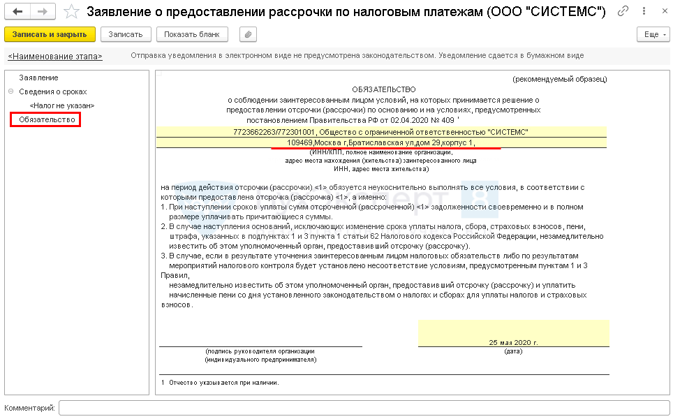 Обязательство заполняется автоматически — отредактируйте вручную при необходимости.