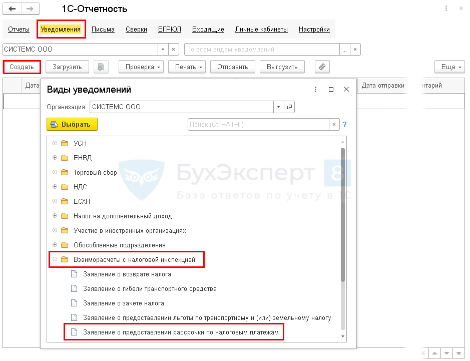 В разделе Отчеты — Регламентированные отчеты — Уведомления — кнопка Создать — папка Взаиморасчеты с налоговой инспекцией создайте и заполните Заявление о предоставлении рассрочки по налоговым платежам (доступно с релиза 3.0.77.78).