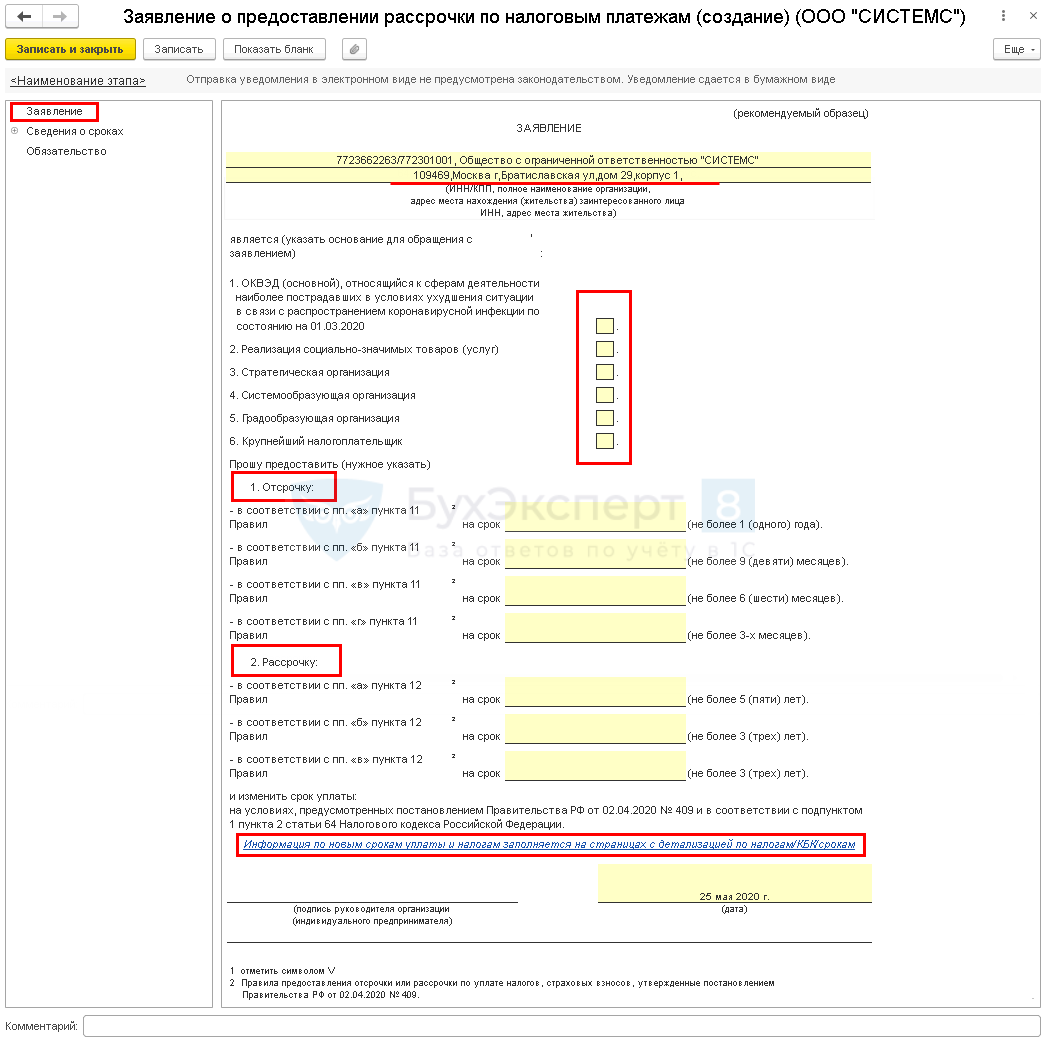 Заявление подается в налоговую инспекцию по месту роботы компании или месту прописки ИП. Компании, причисленные к крупным, могут подавать заявку в ИФНС независимо от своего местонахождения. Документ заполняется на утвержденном бланке налоговиков, одновременно с ним подписывается форма о соблюдении условий льготы и предоставляется крайняя дата погашения задолженности. Срок подачи заявки — до 1 декабря 2020 года.