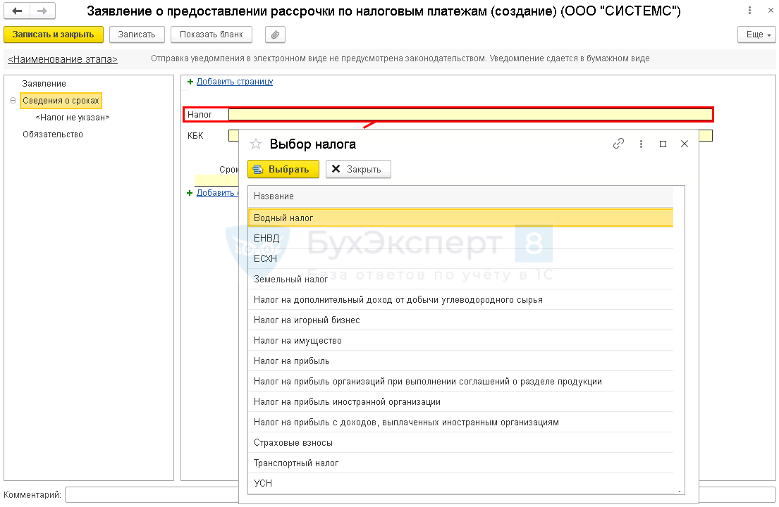 - Налог — выберите из перечня налог, по которому нужно перенести срок уплаты;