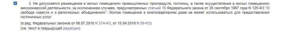 В статье 17 Жилищного кодекса России появилась дополнительная формулировка. Квартиры запретили использовать в целях оказания гостиничных услуг.