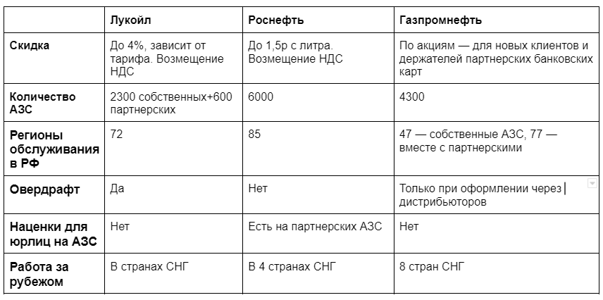 | С предустановленными лимитами | При заказе карты на ней ставится лимит на сутки или на месяц. Если требуется больший лимит, необходимо переоформлять договор. Часто такие карты имеют фиксированную стоимость, независимую от ваших трат. | Фирмам, имеющим четкие лимиты траты топлива. |