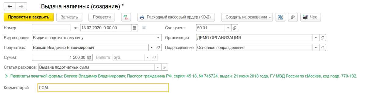 Если водитель сам покупает бензин за наличные, нужно оформить для отражения этого авансовый отчёт. Перед этим оформлена должна быть выдача средств сотруднику. Фиксируется она документом «Выдача наличных», вид операции – «Выдача подотчётному лицу». На изображении ниже показан образец.