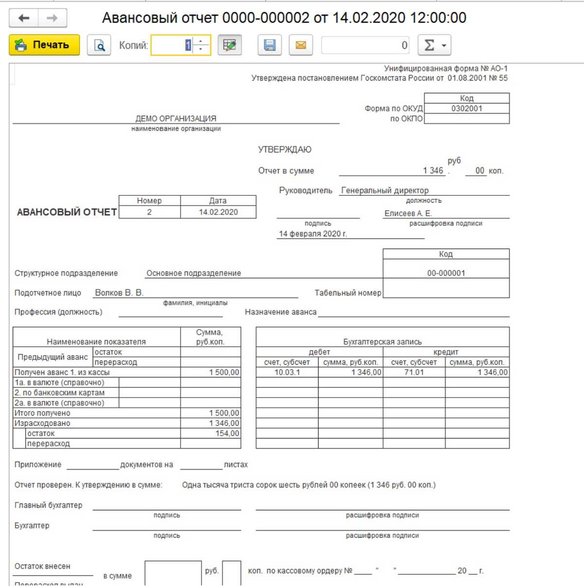 В результате ГСМ через авансовый отчёт будут оприходованы. Проводки: Дт. 10.3 – Кт. 71.01. Для получения печатного документа можно воспользоваться кнопкой «Печать».