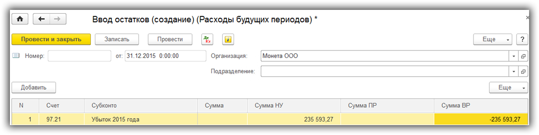 Нужно отметить, что остаток по убытку прошлого года должен быть занесен в систему отдельным от остальных остатков по РБП документом.