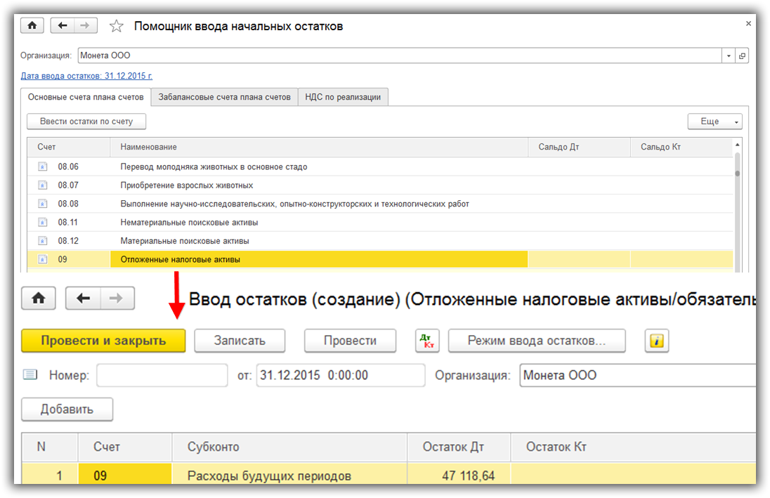 1. Отразим остатки отложенного налогового актива на начало года (цифры используем те же, что были в первом разделе статьи, дата ввода остатков 31.12.2015 года):