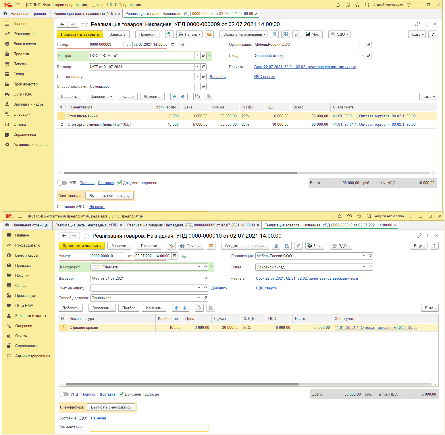 К примеру, заполним два документа реализации и создадим на них один счет-фактуру.
