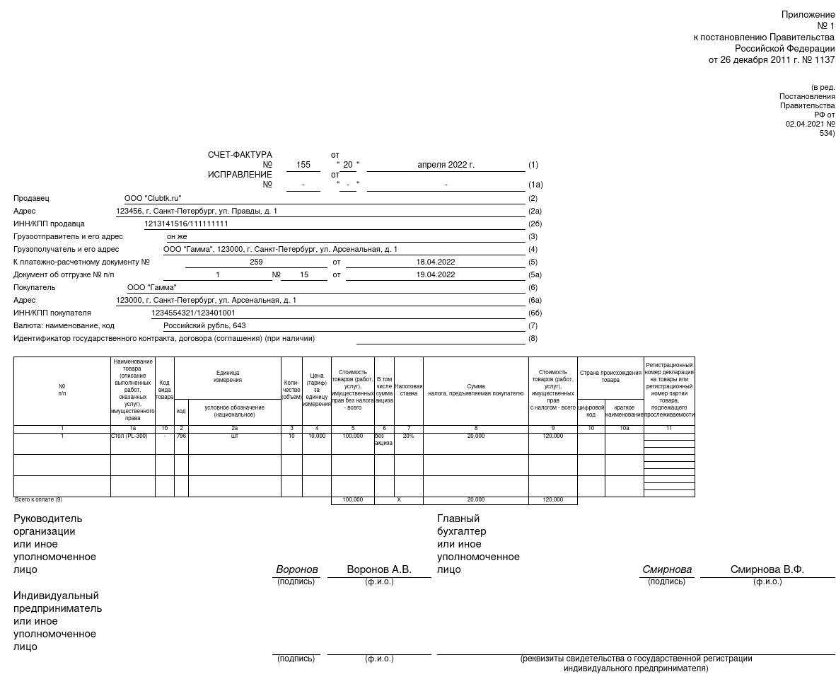Для исправления таких ошибок необходимо составить исправленный документ. Форма его аналогична первичному. Заполняя его, необходимо указать номер и дату первичного документа в строке 1, а в строке 1а — номер и дату исправления.