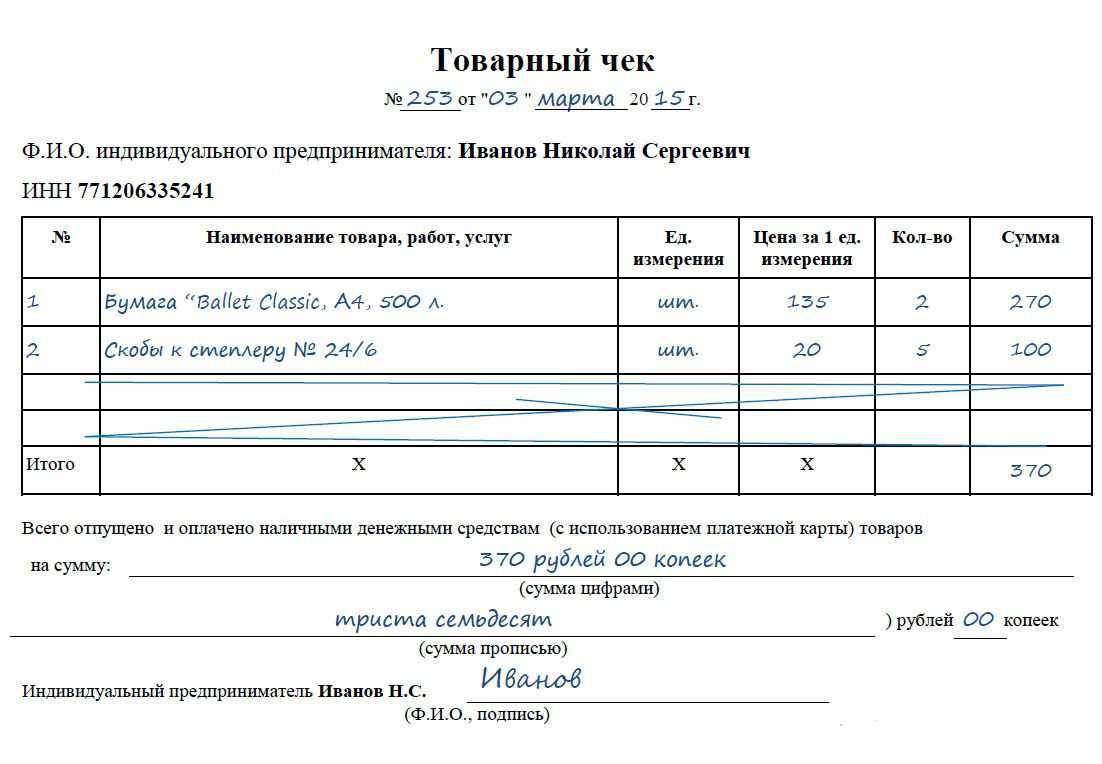 Однако начинающие индивидуальные предприниматели часто задаются вопросом: «Когда уместно выписывать товарный чек на услуги?». В законодательстве существует вполне определенный ответ на это — его выдают по требованию приобретателя товара или услуги. Также индивидуальный предприниматель имеет право вручать его каждому из своих клиентов по желанию.