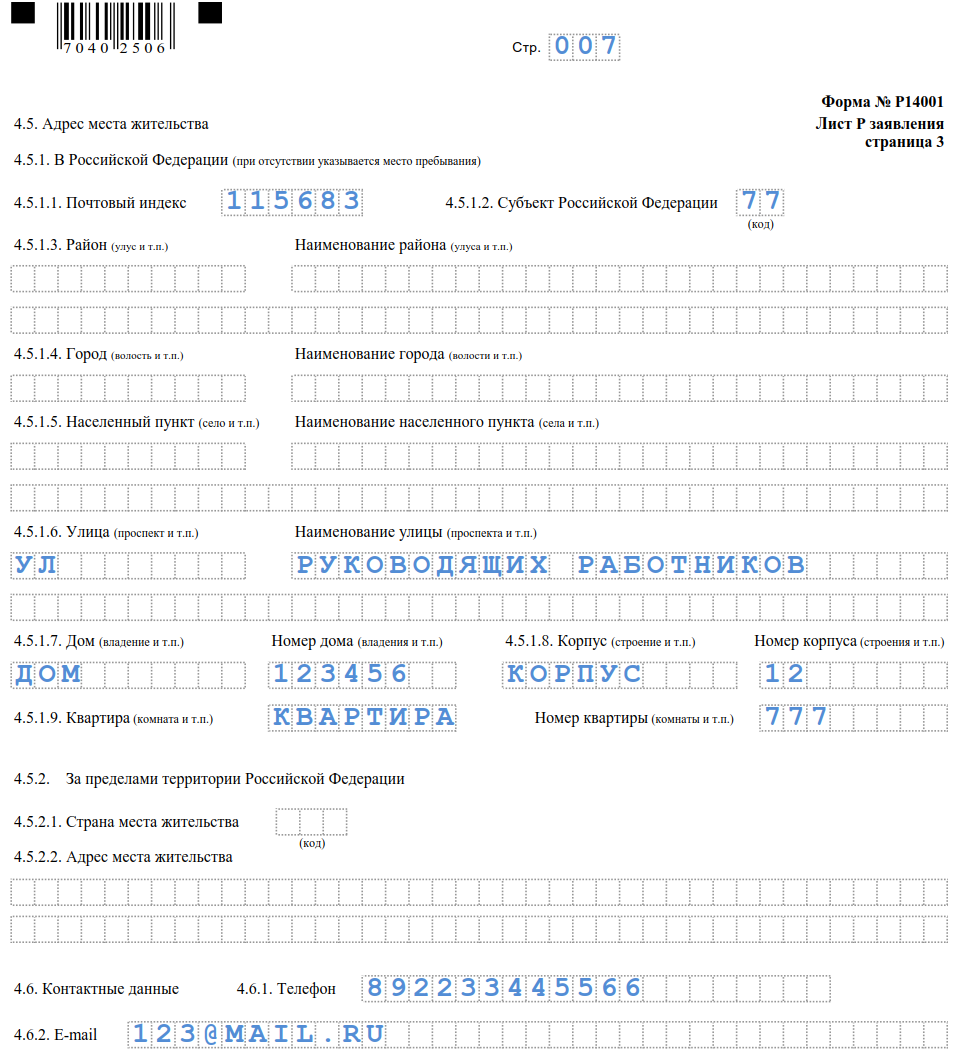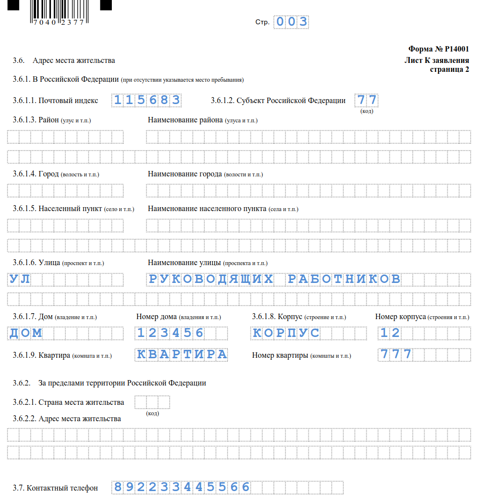 Теперь переходим к заполнению второй страницы листа «К» заявления. Вносим данные о почтовом индексе и коде субъекта РФ. Адрес места жительства на территории России (поля 3.6.1.3–3.6.1.5) не нужно заполнять, если новый руководитель зарегистрирован в городе Москве или Санкт-Петербурге. Для других регионов заполнение обязательно.