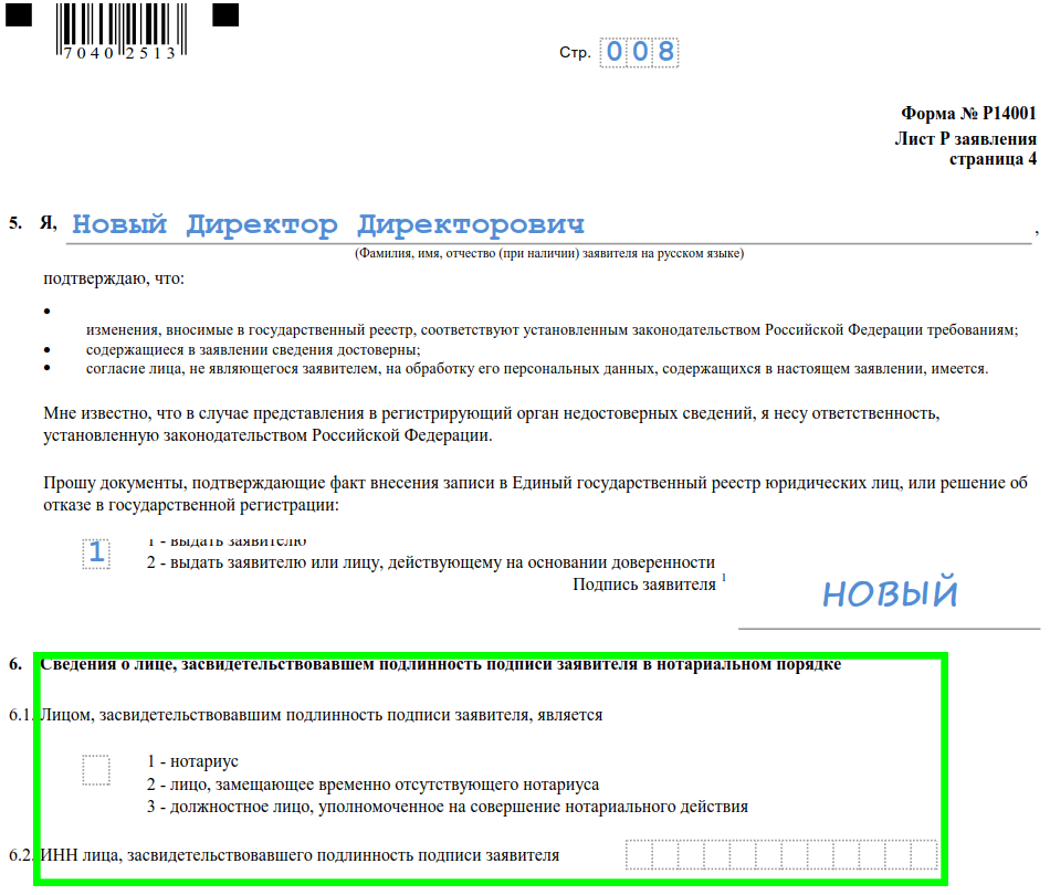 Четвертая страница заявления. Ее заполняют в присутствии нотариуса. В пятом разделе новый директор указывает свое Ф.И.О. и ставит собственноручную подпись. Раздел № 6 заполняет нотариус.