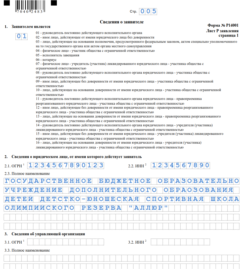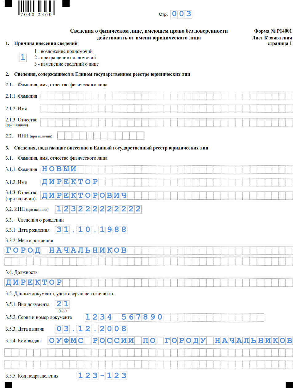 - Код сведений «1» — возложение полномочий. Для сведения: к примеру, если директриса вышла замуж и сменила фамилию, то укажите код «3». В остальном заполняйте документ в общем порядке. Такие же условия действуют, если заполнять образец формы Р14001 при смене директора ООО, АО, НКО и других форм.