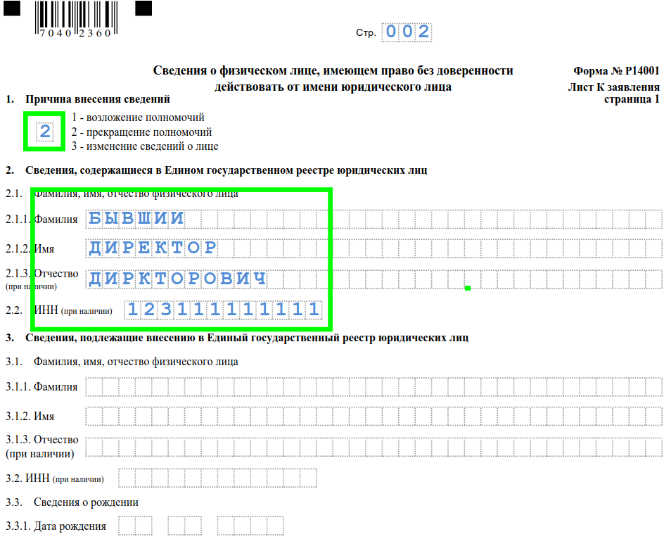 заполните сведениями о новом руководителе. Заявителем будет он. На странице 1в пункте 1 укажите код “1” — “лицо, действующее от имени юридического лица без доверенности”. После этогов пункт 2 внесите информацию о директоре.