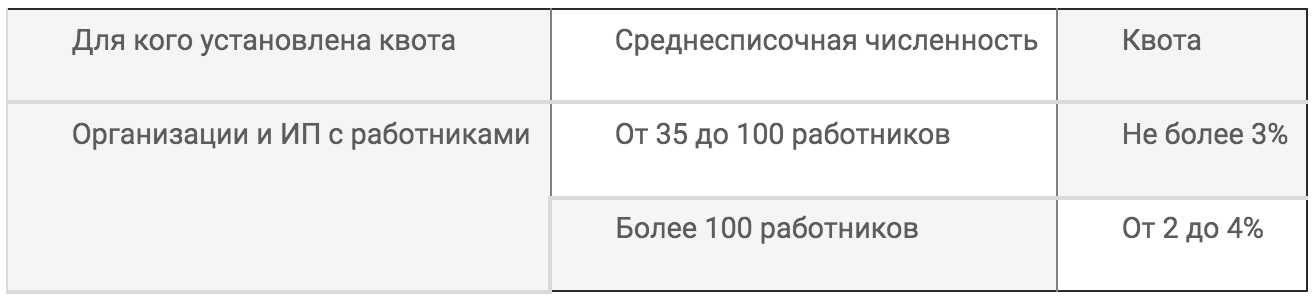 Компании со штатом более 100 человек обязаны соблюдать квоты по приему на работу людей с инвалидностью в размере от 2% до 4% от среднесписочной численности работников. Для организаций, в которых численность работающих составляет не менее 35 и не более 100 человек, квота приема инвалидов может устанавливаться органами местного самоуправления в размере не более 3% от среднесписочной численности работающих.