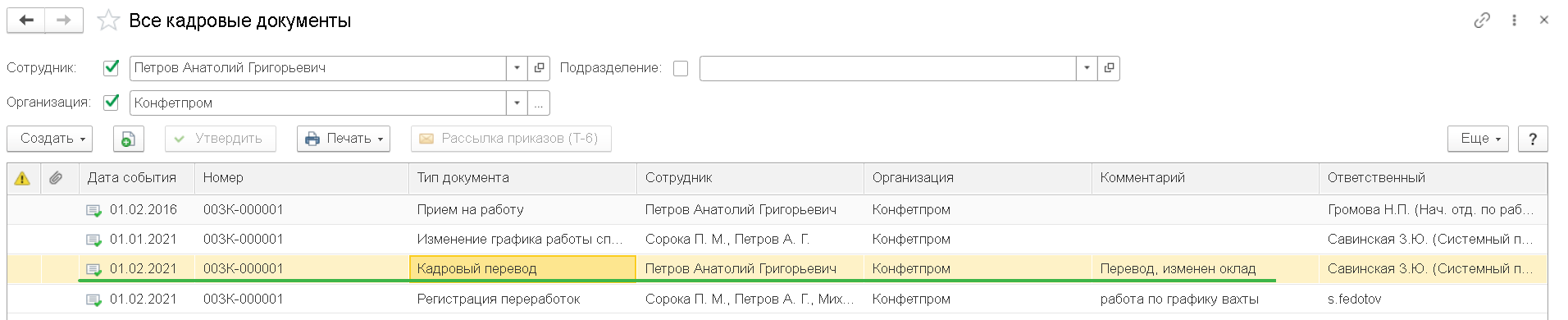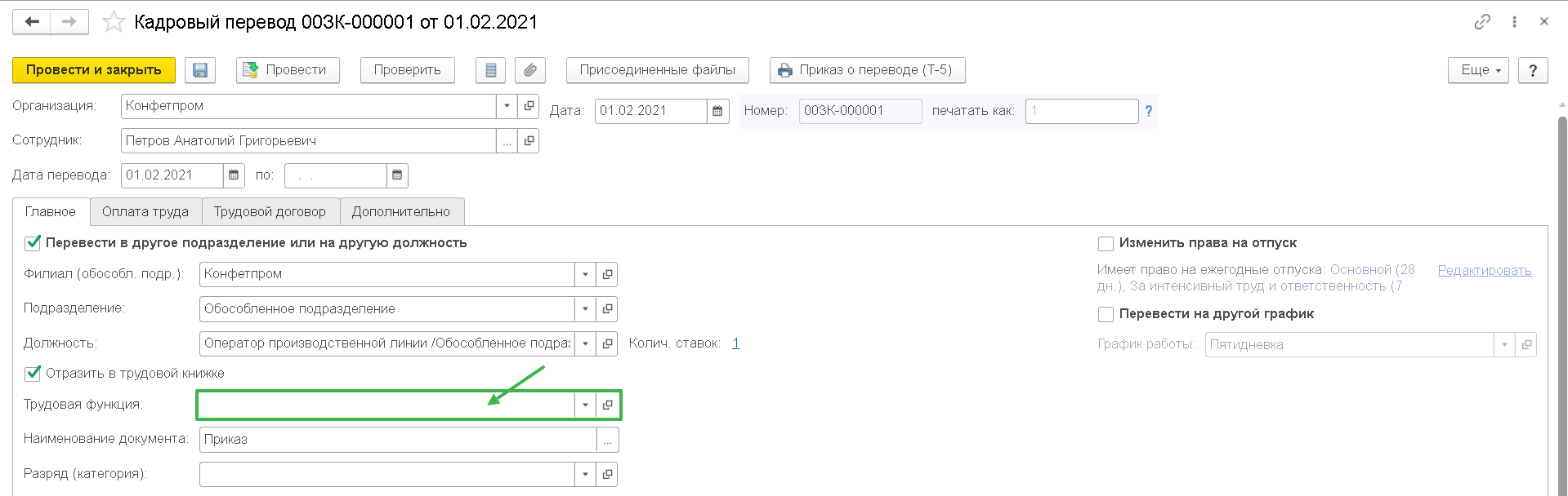 Сохраняем изменения и выбираем в кадровом документе данную трудовую функцию.