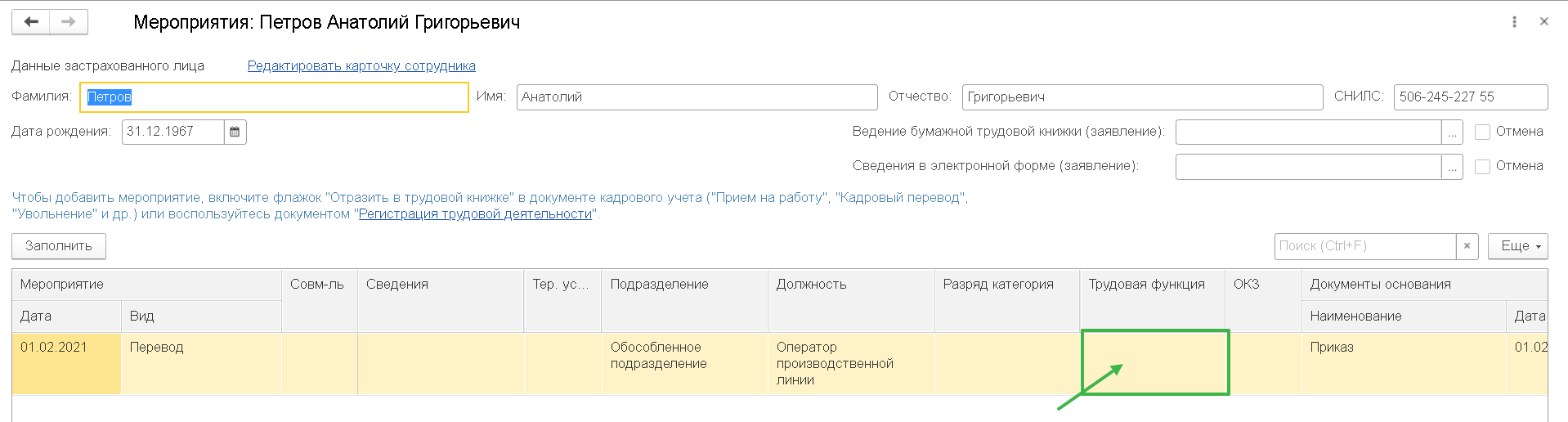 Если в расшифровке мероприятия СЗВ-ТД, подаваемого с начала июля 2021, у вас трудовая функция не указана, вам необходимо будет: зайти в документ, регистрирующий данное мероприятие (в примере – Кадровый перевод), провалиться в поле Трудовая функция, создать нужную запись трудовой функции с кодом, полученным из ОКЗ, провести документ, после чего вернуться к СЗВ-ТД и перезаполнить его. В идеале — указать предварительно трудовую функцию в позиции Штатного расписания. Тогда она выберется автоматически при формировании кадрового документа.