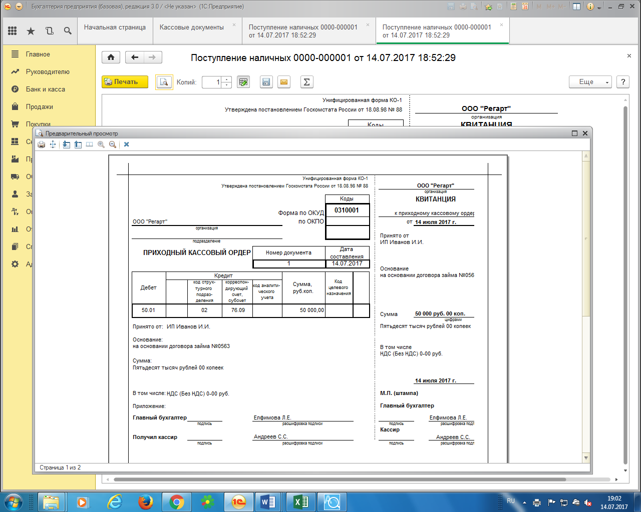 Подобный заём может быть осуществлён как в безналичном порядке, путём перечисления средств на расчётный счёт, так и наличными средствами, путём оформления ПКО (приходного кассового ордера – см. рисунок 1), квитанцию от этого «приходника» ИП забирает себе как доказательство дачи денег в кассу фирмы. Организация, в свою очередь, согласно указанию ЦБ РФ от 11.03.14 №3210-У, должна перевести эти деньги на банковский расчётный счёт вследствие превышения кассового лимита. Обратно денежные средства ИП получает либо на расчётный счёт, либо путём оформления РКО (расходного кассового ордера).