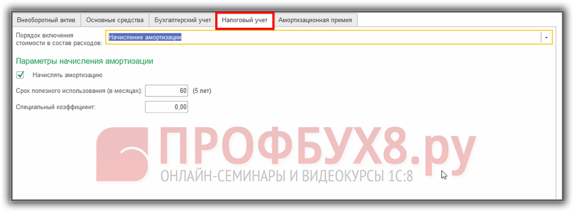 Также, по аналогии, заполним нужные поля, на вкладке Налоговый учет:
