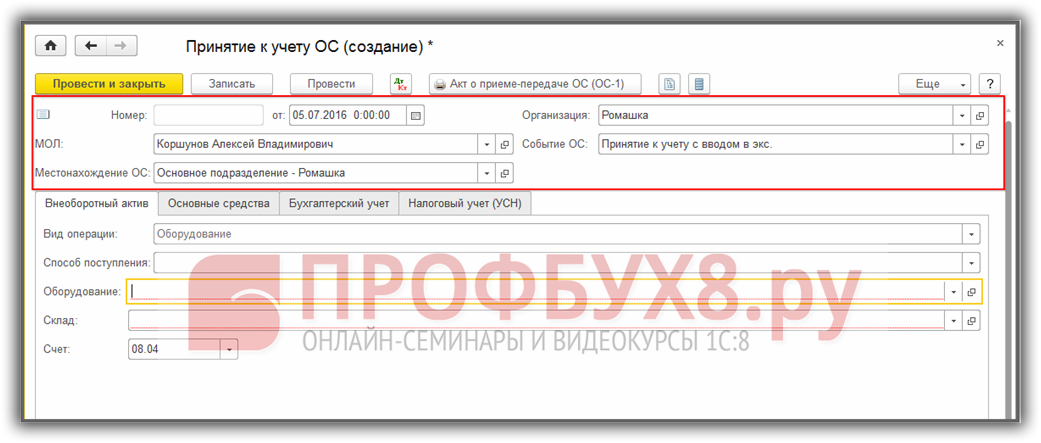 Нажмем Записать и закрыть. Выберем новое ОС в документе принятия к учету: