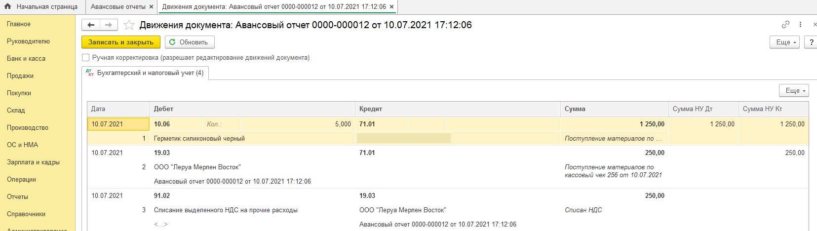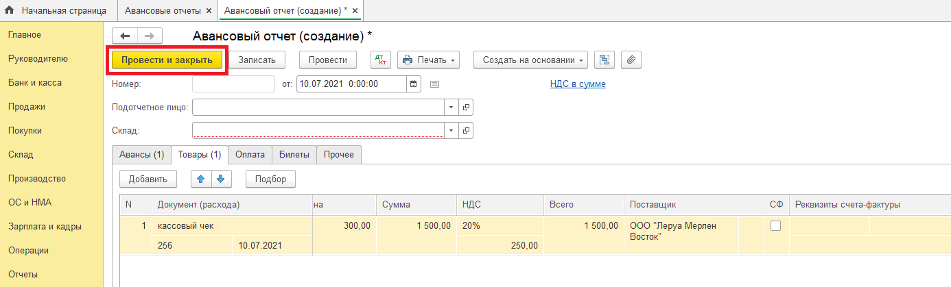 Считаем, что в остальном авансовый отчет заполнен. Нажимаем Провести и закрыть.