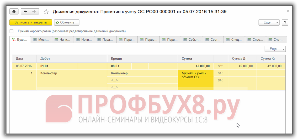 Проведем документ, нажав Провести. Посмотрим, какие проводки сформировала программа 1С 8.3. Видим, что ОС из комплектующих в 1С 8.3 успешно принято к учету.