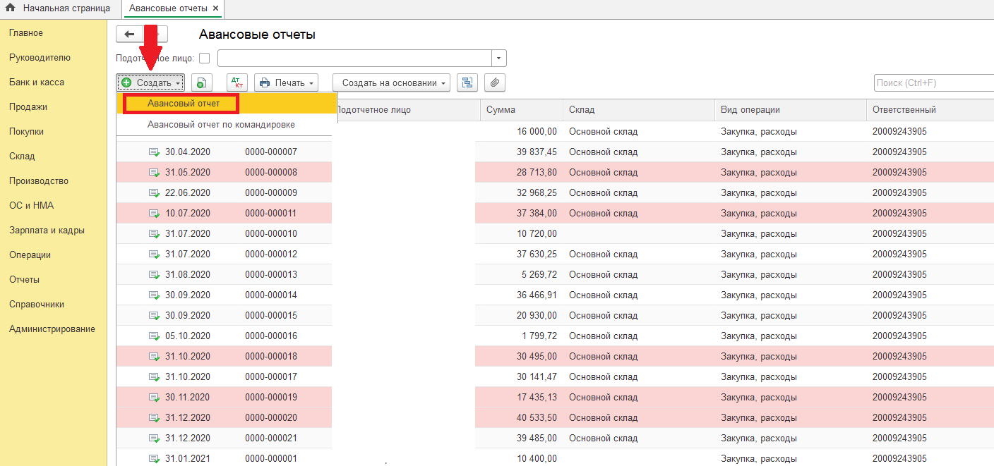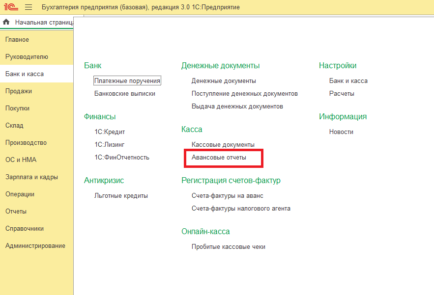 Далее в разделе Касса выбираем Авансовые отчеты.