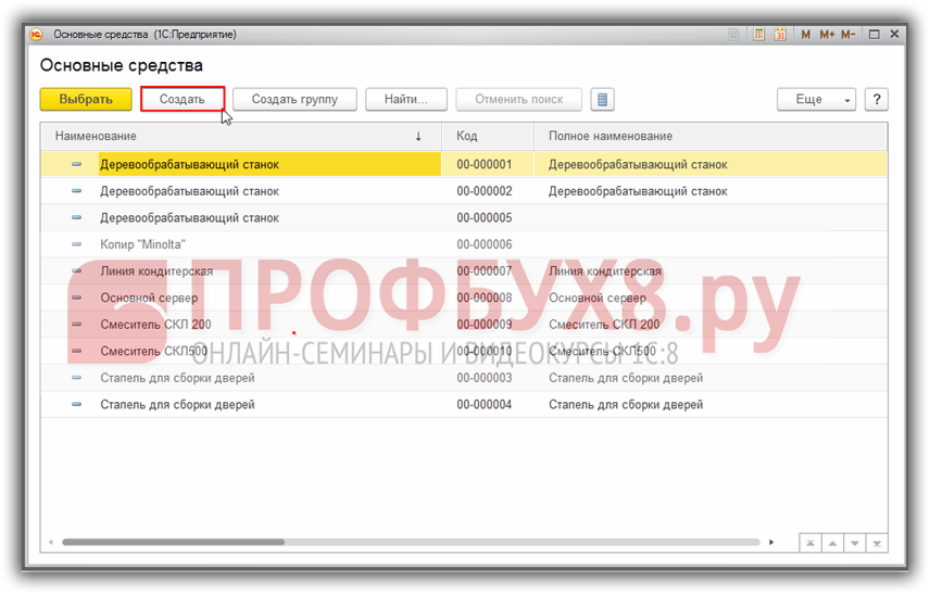 Перейдем в справочник Основные средства, кликнув по полю Основное средство в табличной части. Там добавим новый элемент, кликнув Создать: