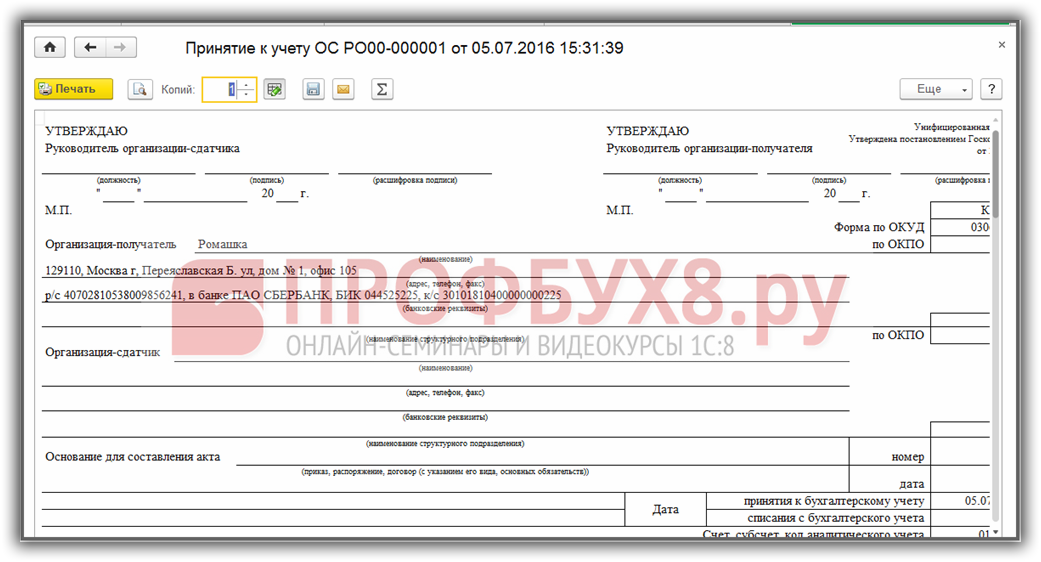 Из документа принятия к учету в 1С 8.3 можно также вывести на печать Акт о приеме-передаче ОС: