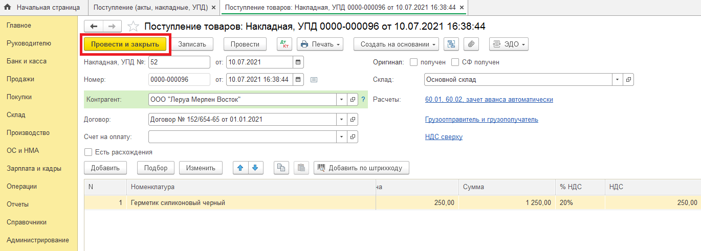 Далее вносим внизу номер и дату УПД или счета-фактуры и регистрируем его. Делать это надо в любом случае, даже если мы применяем УСН.