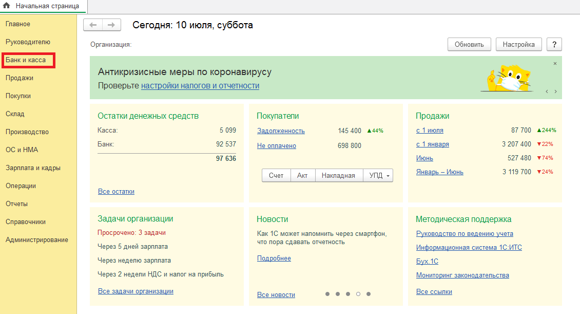 На главной странице в желтом поле слева выбираем Банк и касса.