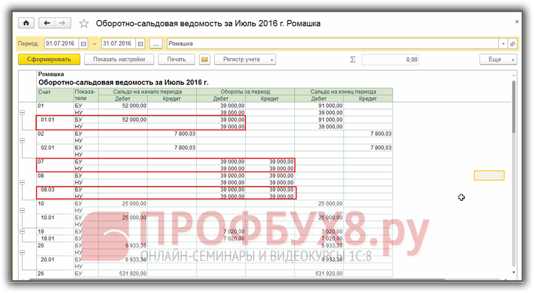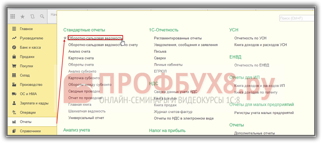 Также можем сформировать «оборотку», чтобы убедится в правильности всех действий: Отчеты – Оборотно-сальдовая ведомость: