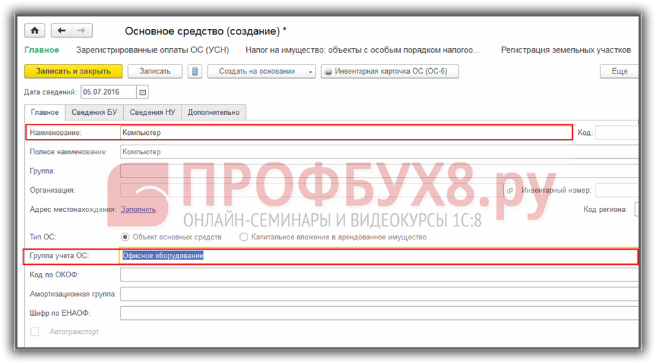 Большинство реквизитов заполнится после проведения принятия к учету ОС, поэтому пока заполним только наименование и группу учета: