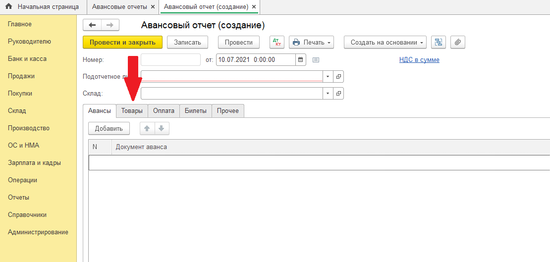 Подробно на заполнении авансового отчета мы останавливаться не будем. Рассмотрим только, как внести материалы в него. Сделать это нужно на вкладке Товары.