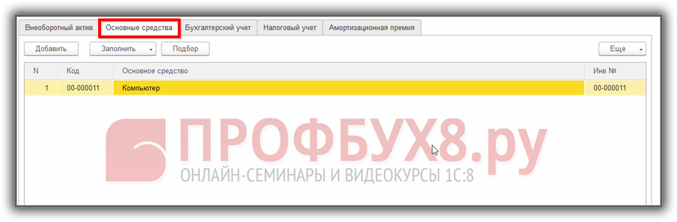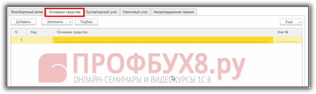 Проследуем на вкладку Основные средства. Таблица документа здесь пока не заполнена. Чтобы ее заполнить, необходимо создать ОС: