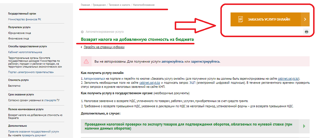 Для этого потребуется авторизоваться на портале и перейти по вкладкам «Главная», «Гражданам», «Таможня и налоги», «Налогообложение» и выбрать услугу «Возврат налога на добавленную стоимость из бюджета».