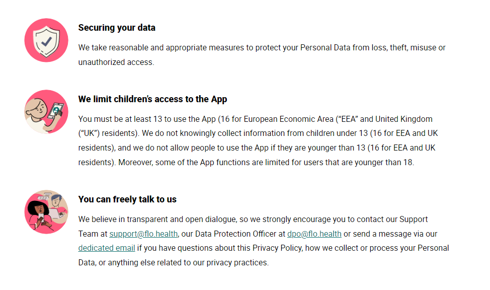 Фрагмент политики конфиденциальности приложения Flo. Компания разговаривает о данных дружелюбно: понятным языком, с хорошим оформлением, картинками