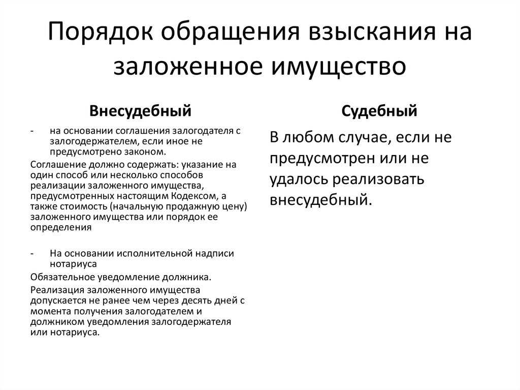Теоретически существуют и другие случаи, когда обратить взыскание имущества нельзя во внутрисудебном порядке. Часто условия о порядке обращения уточняются непосредственно в конкретном соглашении. Рекомендуется всегда заключать соглашение в виде, аналогичном договору, сформированному до этого.