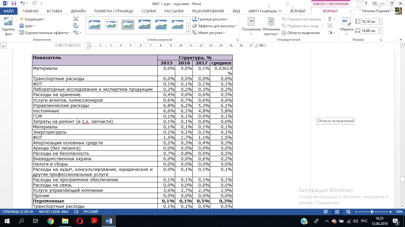 - Определена средняя доля расходов в выручке постатейно за 2015-2017 г. Результаты расчета приведены в таблице ниже: