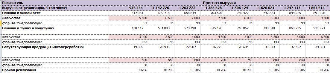 - Осуществление прогноза выручки исходя из изменения объемов продукции в натуральном выражении (свинина в живом весе, в тушах и полутушах, сопутствующая продукция мясопереработки). При прогнозировании выручки предполагается сохранение цен на среднем уровне за последние 3 года. Для демонстрации наглядности расчетов, прирост выручки в натуральном выражении осуществлялся следующим образом: