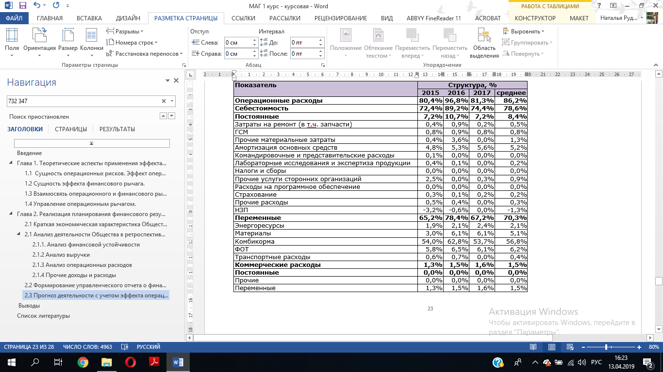 Определение доли операционных расходов в выручке в ретроспективном периоде, %