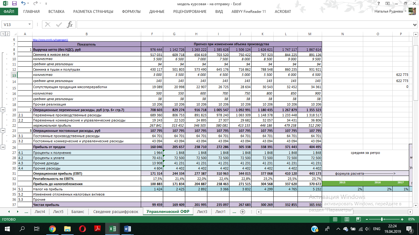 - Перенос результатов в управленческий отчет о финансовых результатах. Поскольку у производителей сельхозпродукции налог на прибыль действует только в отношении прочей деятельности, его величина была рассчитана на основе эффективной ставки (средняя доля налога на прибыль в прибыли до налогообложения в ретроспективном периоде). Изменение ОНА и прочие были обнулены. Проценты к получению, проценты к уплате, прочие доходы и расходы были приняты на среднем уровне за 2015-2017 г. Прогнозный управленческий отчет о финансовых результатах представлен ниже:
