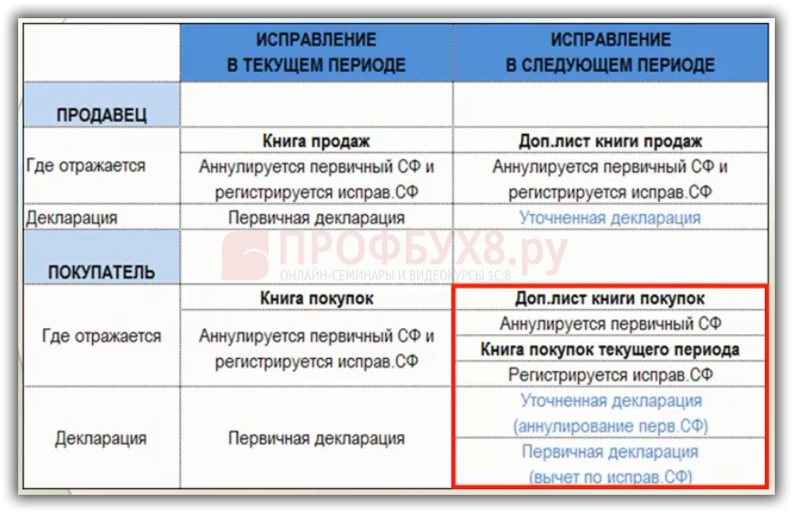 Инструкция учета исправительного счета-фактуры отражена в таблице: